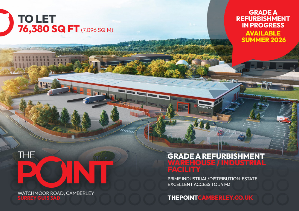 The Point is a HQ industrial / warehouse facility in Camberley located on a self-contained site of 3.8 acres with a site coverage ratio of 50%. The unit will be extensively refurbished to provide high quality specification including 8.2m eaves height (minimum), 5 ground level and 3 dock level loading doors (flexible ratio), and open plan CAT A office space of Grade A specification.